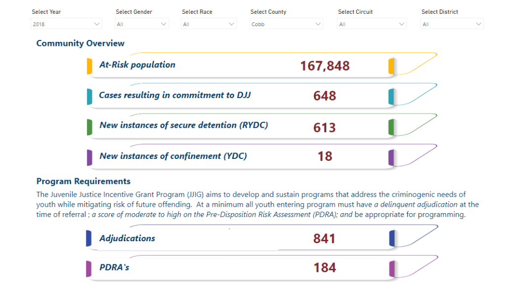 This dashboard reflects the number of youth at each contact point Georgia’s juvenile justice system.